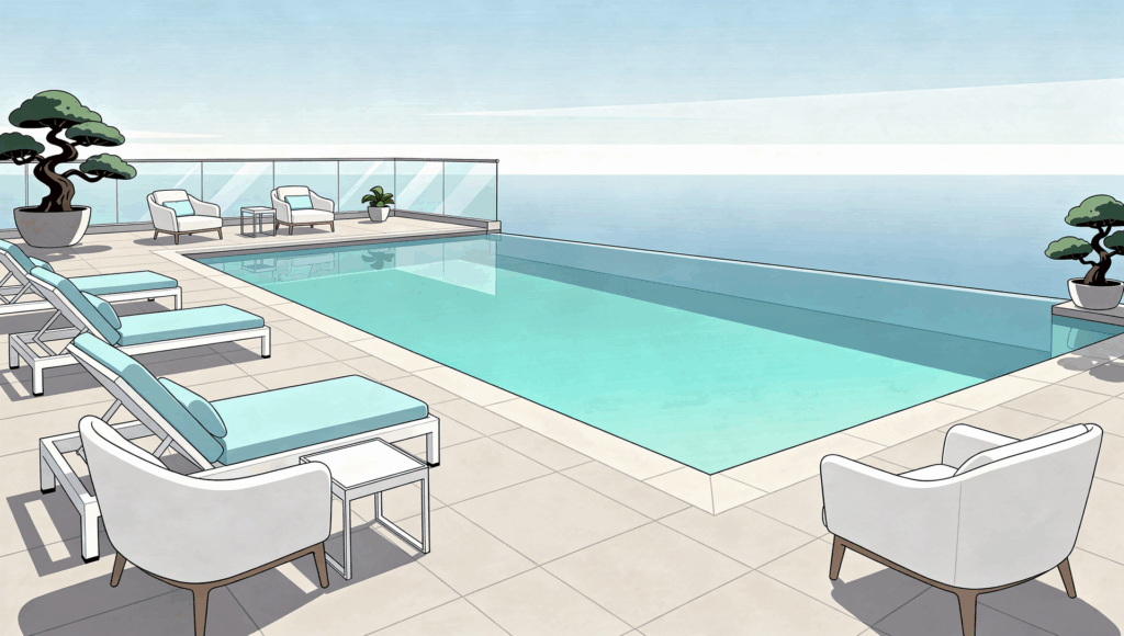 Infinity pools, cabanas, and entertainment spaces with panoramic city views
